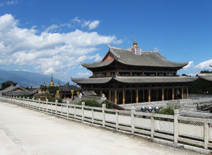 位于剑川县南部的石钟山。石钟山古时候称为中山,因有形如巨钟的红丹霞岩,故称为石钟山。石窟分石钟寺、狮子关和沙登箐三个片区,共计16窟139尊造像, 是我国最南方的一个石窟群,有“南天瑰宝”之称。