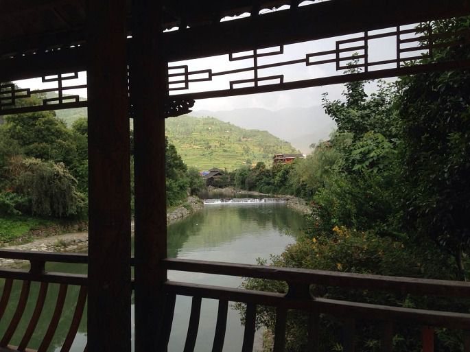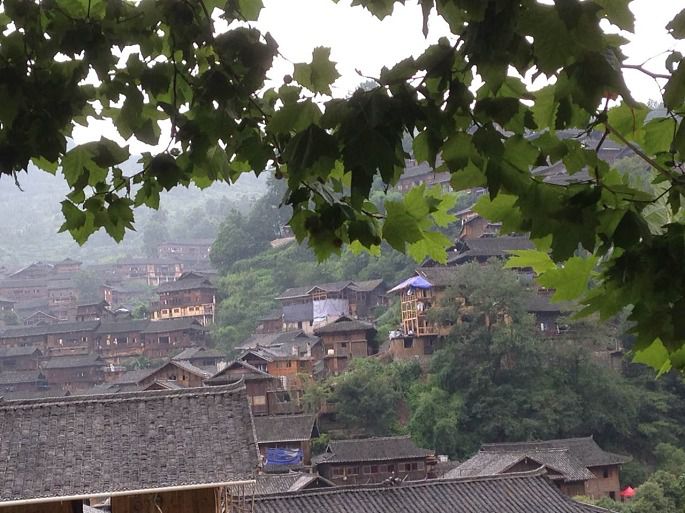 (3)吃饭:君临客栈老板建议在他家吃,他家煮,干净、卫生,因此就在他家的美人靠边上摆了“长桌宴”,菜倒也清爽可口,有一份土鸡汤(城市里难得喝到如此美味的鸡汤了);又上了酒瘾,喝了他家的苗家米酒(一斤20元)。美酒佳肴,靠着美人靠,美景在前,人微醺,心情超爽的。