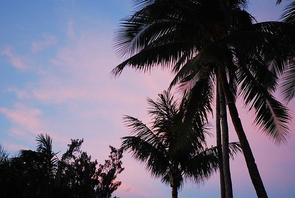 被夕阳染红的云层,映衬着椰林,形成一道风景。