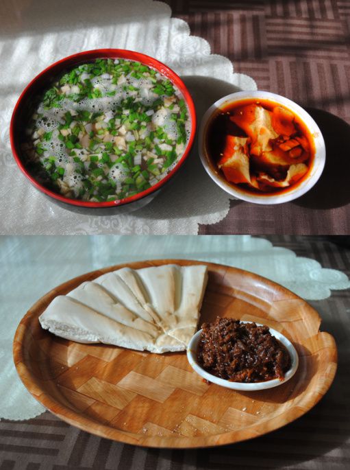 回民街其实叫回坊才更为确切,由纵横相错街道(北院门、西羊市、北广济街、大皮院等)和镶嵌其间的几个清真寺组成。自汉代丝绸之路迎来阿拉伯、波斯等的先民,回民就在此地聚集而繁衍生息。到如今,竟然成了著名的旅游景点。北院门是回坊最热闹的一条街,外乡客通常以为北院门就是回民街,而著名天下的“贾三”清真灌汤包,就是回民街美食的代表。可惜,能让我搛不起一个完整汤包(一笼有两个破皮。搛三而不得,皮底牢牢粘在笼屉上)、吃得出“柴味”的牛肉馅、食一而再无其兴者,唯“贾三”也!北院门游人如织,各种小吃店家鳞次栉比,错杂各种小商品店。恍若走在上海城 隍庙中,只是店家多数是戴着小白帽的回民。说实在话,背着个大登山包走在熙熙攘攘、嘈嘈杂杂的回坊,感觉肯定好不到哪里!不过这个大包却帮了我一个小忙。 在西羊市127号“老米家大雨泡馍”(回坊找吃食店,不能只看“老某家”,有时还得看后面跟的字),店里店外几乎坐满食客,老板娘看我背个大包,捧着个大 碗(普通“羊肉泡馍”,送馍一块,本想自己掰),里外寻位子,头上汗珠直冒,忽然对伙计大声一喊:“有赶路的,先给他弄。”让我换成机馍(机器自动绞的 馍,省时)端给伙计,真的很感激西安迎接我们的好客。5分钟后,一碗热气腾腾的羊肉泡馍到手,老婆帮着在外面给寻了一个位子。西安人 吃羊肉泡馍,讲究的是个悠闲,悠悠地花半小时掰馍,再闲闲地等(羊肉泡馍是一碗碗煮出来的,详细过程见后几天攻略)馍。最后慢慢品尝那一块块小小碎碎浸透 了羊肉汤汁的美馍。今天实在是不巧,星期天,回坊人多拥杂,再加身上背个大包,超级影响我品尝美食的心情和口感。粗粗而食,只觉机馍虽松软,但入味不深, 羊汤倒是浓口不腻。再吃里面仅有的几小片肉,微膻而绵。但说句实在话,我吃出了味精味。真正绝好的羊汤,吃不出一点点的味精味,此乃我对羊汤的最高评价。 北广济街拐弯处,有一家“刘纪孝腊牛羊肉”,门口排着长队。伸长脖子望了望,有两种颜色的肉,深色的是酱牛羊肉。浅色的初看是生肉,其实不然,此乃“腊牛 肉”。寻到北广济街101号“老刘家”,刚好2点半,想进门,掌柜的说“买完了,明天请早”。关门早的店,两个字:好店!回坊有许多卖甑糕和豌豆糕的小 摊,老婆吃了一小块,觉味甚佳。兜了一大圈,回到来时的西大街。在西安,白天在钟鼓楼附近打出租,近乎痴人做晚梦。好在7路就在眼前,4站华夏银行下。寻着到和平路87号如家大差市店。办理登记手续,入房放好行李。对门大差市站(华夏银行站感觉略远)坐40路至小雁塔。不急着寻塔,先再找点吃食。“乾州食府”里有四块中国烹饪协会颁发的“中华名小吃”铭牌,分别是:乾州浇汤面、乾州锅盔酱辣子、乾州豆腐脑、乾州馇酥。乾县乾州古城位于陕西省咸阳市乾县(又名奉天古城),这四大名小吃是当地的特产。由于此行匆忙,乾州古城并未在我的旅行行程中,只能退而其次,来此店一谗膏吻。写文章时查到一当地人的点评:“其实乾县离西安不远就60几公里,如果大家有兴趣可以去乾县吃一下,尝尝正宗的乾县小吃,豆腐脑,锅盔加酱辣子,酸汤面,馇酥,菜疙瘩,御面,很多好吃的小吃,顺便可以逛下乾陵,武则天和李治的合葬墓。就离乾县县城中心10分钟的车程。”此次西安之行,唯一的遗憾是汉阳陵耗费掉大半天时间,若换成乾州古城,或可称为完美之旅。此乃后话。乾州浇汤面也叫“一口香”,是咸阳乾县等 地待客之面。面条细、长、筋,浇面汤料浓、香、略酸。吃浇汤面有讲究,将煮熟的细面从锅里捞出,盛在冷水盆里过一下,然后捞出一小筷,浇淋滚烫的汤料食 之。故乾州食府的配套浇汤面为:锅底15元/份,肉臊子10元/份,面10元/蓝(几小团),小菜7元/份。整套是42元,问题是我们吃不下如此多啊!跟 店家商量着来一碗(10元/碗)。这面当然就略失其所谓“浇汤”之味,不过大致我可以描绘:面上一层葱花间杂香菜少许,白菜末、蛋皮末、肉哨子在碗里若影 若现,面吃着细而柔软,汤浓而微酸。当然,最正宗的吃法是一筷子一小小碗,一筷子一口,那才是真正的“一口香”。