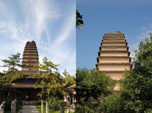 走过石桥,穿过茂密的林丛,小雁塔的 玲珑身躯越来越近,当站在塔下,仰望这座建造于唐代距今1300多年的建筑,青砖已老,那种古朴的因着岁月而风化的美穿过我的眼睛,直透我心。伟哉!大 唐!伟哉!中华!从荐福寺园中取景拍照,寺、塔、树、蓝天,特别是那一刻的白云,若漂丝状,如华光划过蓝色的天际,光彩夺目。这座1300年的美塔,配得 上这永恒的蓝天!