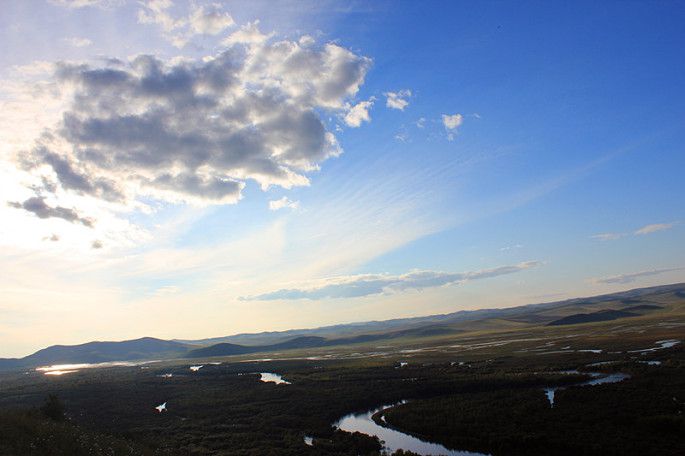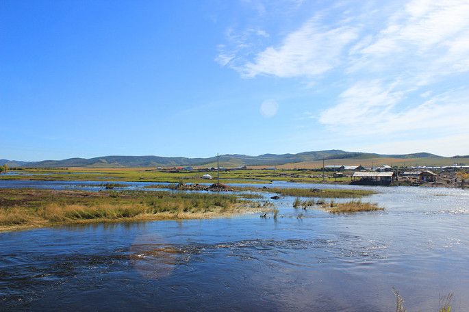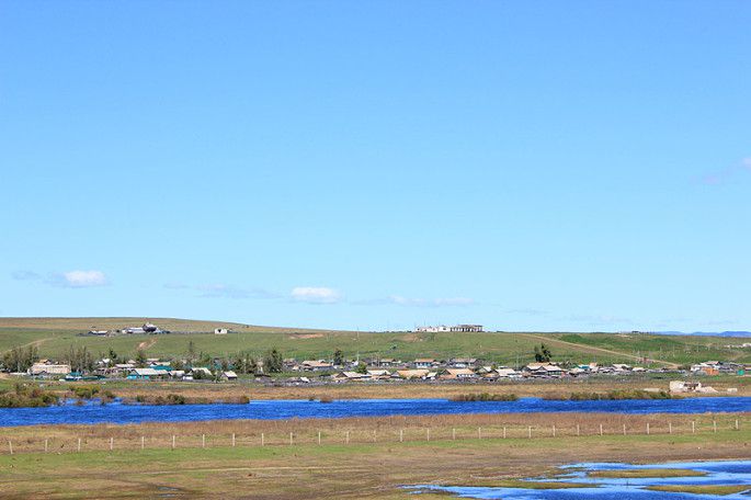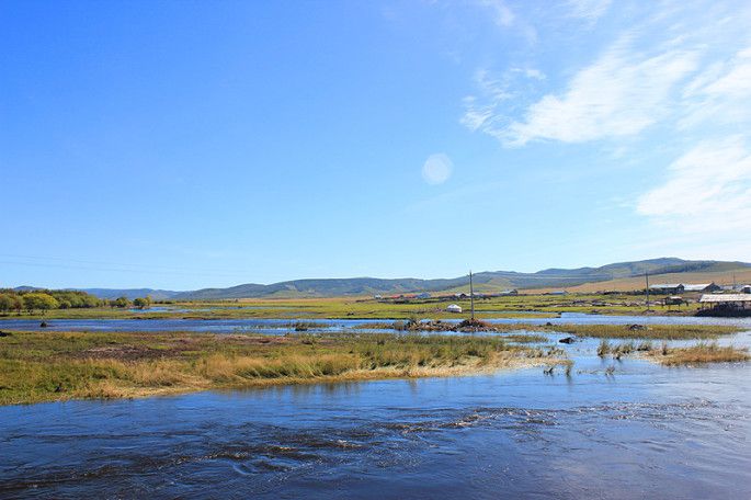 第一个风景点就是位于陈巴尔虎旗境内的莫日格勒河,她发源于大兴安岭西麓,由东北向西南,流经著名的呼伦贝尔大草原,注入呼和诺尔湖后流出,汇入海拉尔河,全长290多公里,属中俄界河额尔古纳河水系。本来是有个景点叫金帐汗的,我们没有开进去,停到了路边,也一样可以看到蒙古包,蓝白的哈达飞扬着,