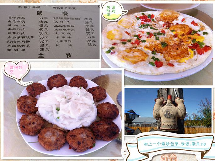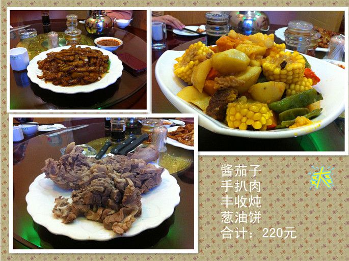 游览完根河湿地,我们按照原定计划到拉布大林住宿,由于暑期的旺季已经过了,住宿相对的便宜,还可以讨价还价,最后我们以150一间的价格订了两个标间,放下行李,饿的不行的我们立马出去觅食了。攻略上看了很多手扒肉的介绍,就选择了蒙餐,是李哥战友家开的,我们只想尝尝鲜,就要了两斤,店家觉得少,说不好切,结果弄来2斤8两,我们那微薄的战斗力啊,最后还是浪费了些,另外还要了酱茄子、丰收炖和葱油饼,领教了大菜量!