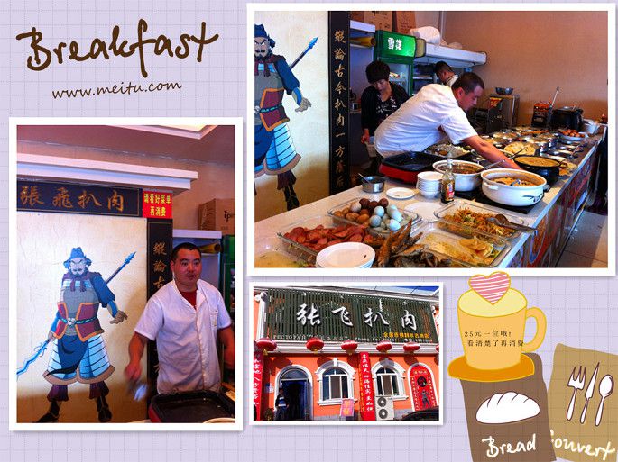 7:30 宾馆门前集合,开车到张飞扒肉吃早餐,自助早餐25元一位,小贵了啊,也可以单点的,李哥说那样会便宜不少。但是我们很满足于各色小菜、主食、粥,吃的饱饱暖暖的出发了喽!