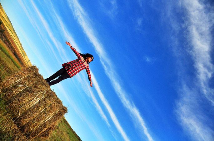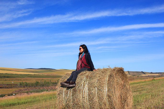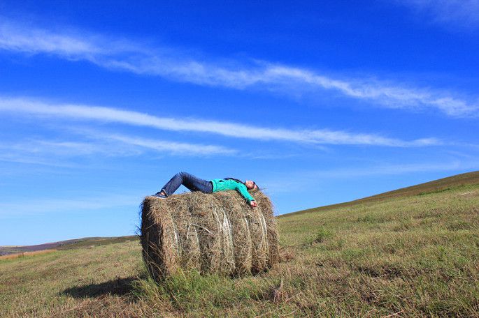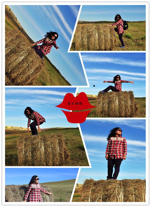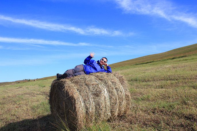 路过一个小小山坡,草卷散落着,还没有铁丝网维护,我们下车飞奔而去,选了一个品相不错的,就轮番的爬上去,坐、卧、站立着的各种狂拍......