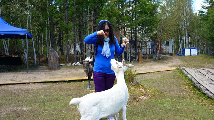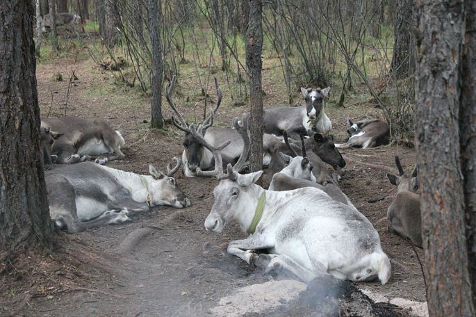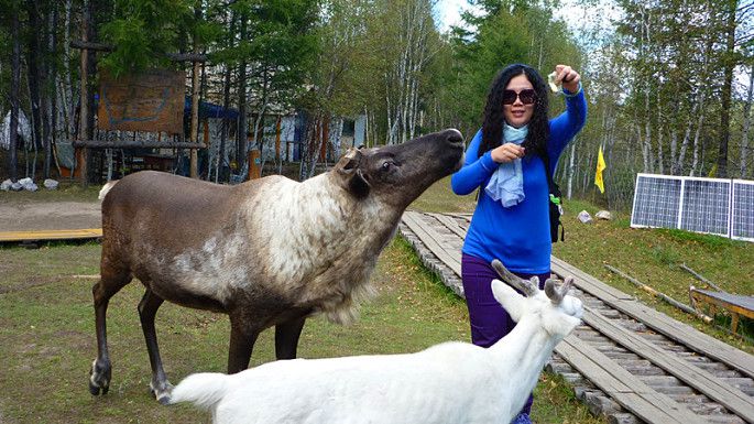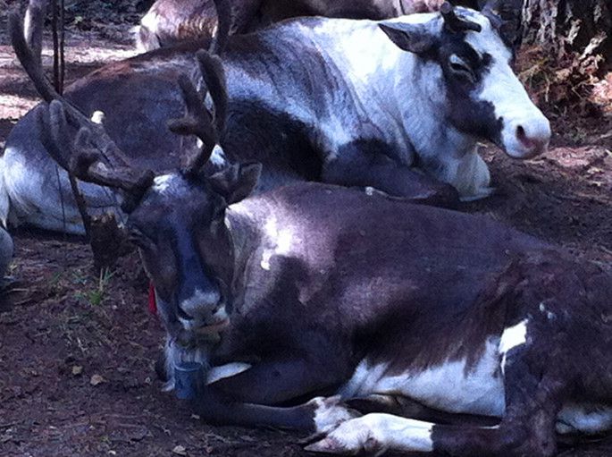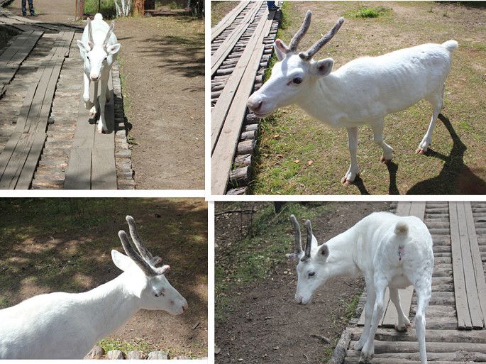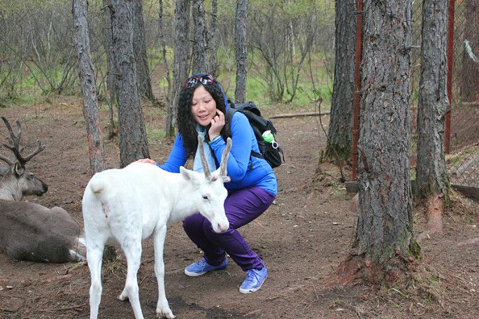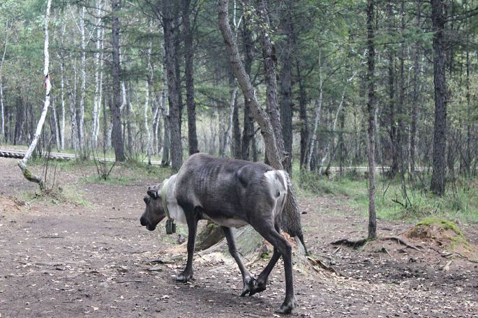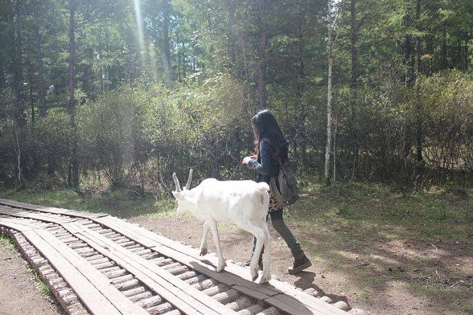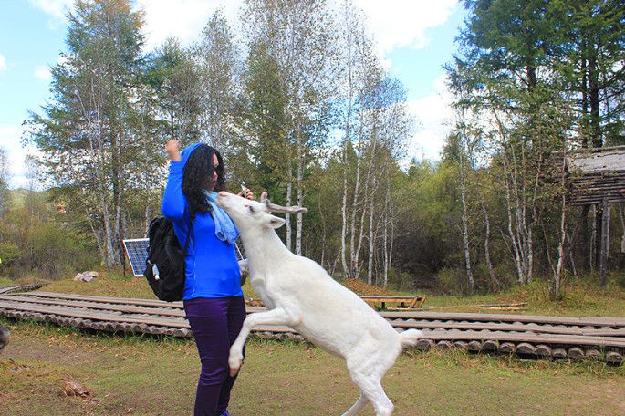 甜菜和小铁对动物不感冒,我和飞Girl每人花了30元去看驯鹿, 驯鹿拉丁学名Rangifer tarandus,英文名Reindeer。它是鹿类中唯一雌雄均长角的鹿,角的分叉很多,有的超过30个枝叉。驯鹿属于北极圈生物,还没有被完全驯化。它们的造型十分奇特,长着马一样的头,鹿一样的角,驴一样的身躯,牛一样的蹄子,盐巴是鄂温克人对驯鹿实施的魔法,驯鹿白天出去觅食,晚上会乖乖的回来吃盐巴,不会丢失。