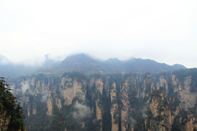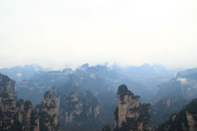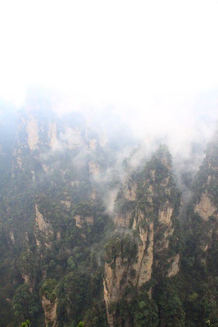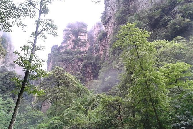 为了闭开团队游览高峰,小伍安排下午5点多才去游览袁家界风景区。首先到达“天下第一桥”,它是一块天然形成的巨大石桥,凌空飞架于两座山峰之间,气势磅礴,雄伟绝顶,与“夫妻岩”并称“武陵源双绝”。沿着石阶前行,一边是数百米的深谷,走不完的路,看不够的景。所谓的“迷魂台”和“后花园”都是著名的观景台,很可惜,因天气不好,迷雾太大,看不真切。值得一提的是在过“天下第一桥”东100米处一观景台所见的景色据介绍是100元人民币反面的画面。 最美一处是后花园,不亏于“扩大的盆景、缩小的仙景”。