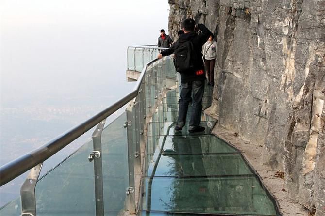 这里是一个中途下车的景点,没有导游,还确实不知道这里还有一条游览线,从“大观台”经过一个加油站步入景区,向下走了一千多台阶,在一处宽敞的地点分了岔路,左路前往“一步难行”,右路前往“仙人桥”。临近“一步难行”时又有岔路,左路前往“一步难行”,右路通向另一个观景台“神鸡啄食”(可一览十里画廊全貌)。“一步难行”处于两崖之间,脚下是万丈深渊,若没有脚下的钢筋架桥,是决不敢跨出这一步的。返回岔路后可以再向“仙人桥”、“天子座”方向进发。