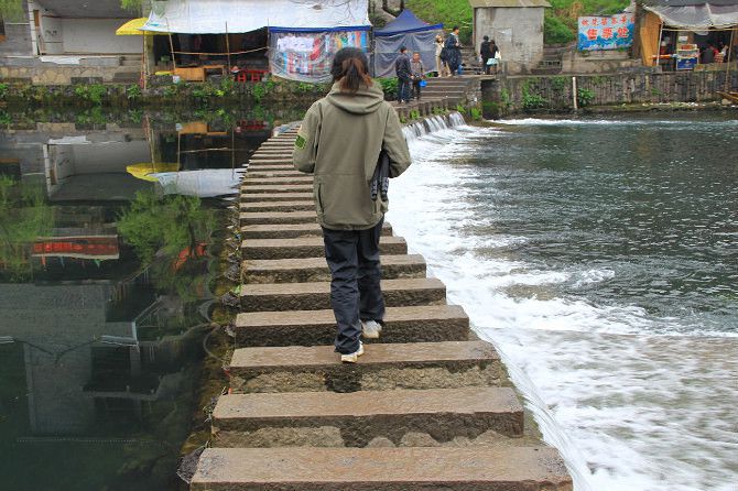 在“天下第一桥”的乘车点乘坐环保车,到了乌龙寨停车场的路口下车,顺着碎石路进入景区。大约前行十分钟后才能看到石板路的游道。