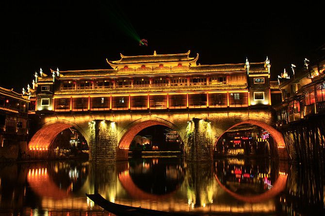 凤凰古城的夜景是非常美丽的。夜幕降临,沱江两岸沙湾吊脚楼群上高高挂起的红灯笼全都点亮了,虹桥上的一排排彩灯染红了一大片江水,如珍珠般的万名塔倒影与遐昌阁相映成趣… 更有趣的是街上叫卖的纸做的花灯,点上蜡烛放在沱江上漂移,好看极了。这时,几乎全城所有的小商贩和来自五湖四海的游客都云集在这里,到处是小摊小贩,卖小吃的、卖水果的、卖小玩意的、卖工艺品的、耍猴的、说唱的,应有尽有。古城的夜晚,是沸腾的夜晚,是不眠的夜晚,是充满活力的夜晚。与他们融溶在一起,去好好享受一下人生吧,说不定你还就会有意外的收获呢。