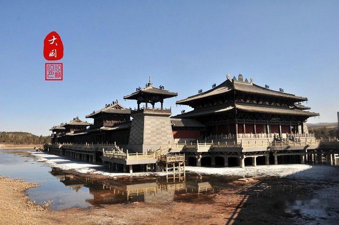 到云冈石窟,先经过一坐山水殿堂,是后期修建的。此时是下午3点多,湖面上的冰花依然未融化。