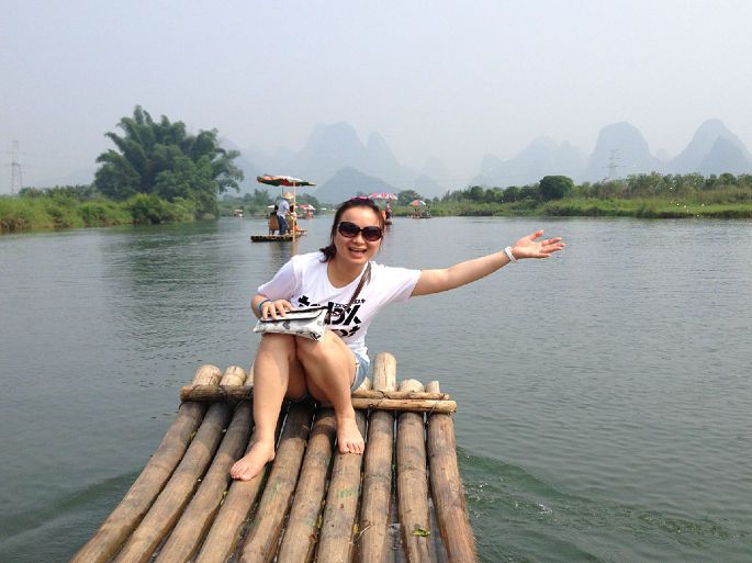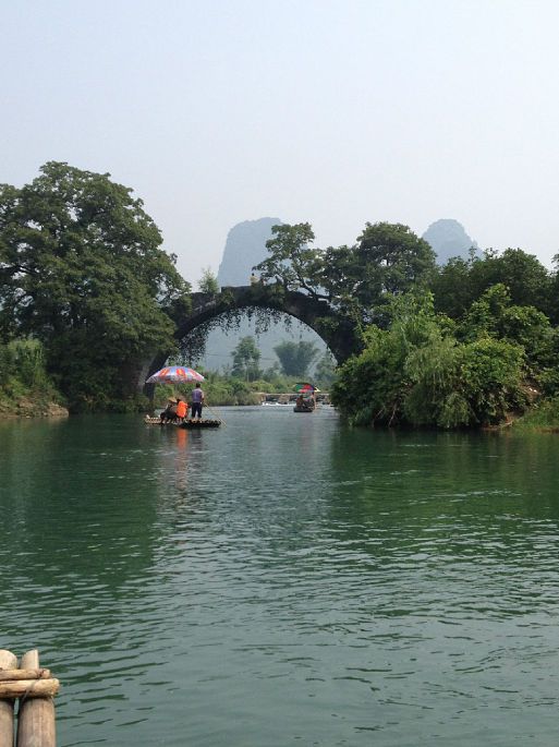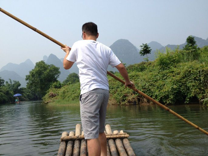 到金龙桥已经是上午10点左右。朱师傅已经在那里等我们了。本来朱师傅说的价钱是190元3个小时1个筏子,后来又给我们优惠了10元,真心不错。遇龙河景色 非常漂亮,真的竹筏哦。远处的山影影约约,一幅漂亮的的山水画。