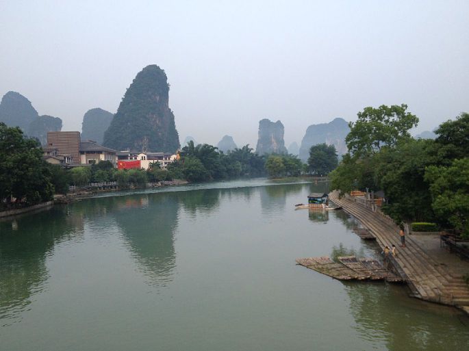 中午1点左右,我们上岸了,在河边找了一个农家乐解决午餐。具体名字忘了,饭菜还可以,我们点了一个炒龙虾和虎皮青椒,花了60多元。这家店还租自行车,可以骑行到阳朔归还,乘着有时间,我们租了一辆自行车,骑到阳朔。中午有点热,好在江边景色不错,吹着小风。自行车是全新的额,因此骑起来非常舒服,花了大概一个小时,才到客栈。抓紧时间休息了两个小时。