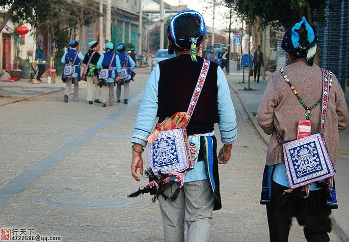 (白族挎包特色鲜明,一种是素净大方的蓝底白色挑花,一种是色彩鲜艳对比强烈的花草图案。)