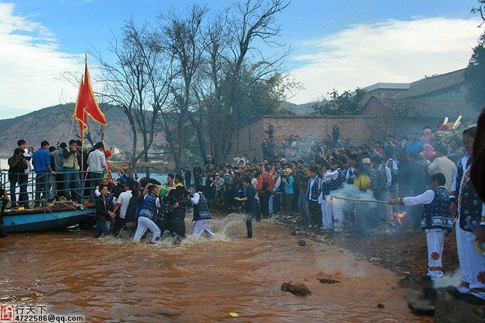 (船终于靠岸搁浅,年轻人跳进水里,簇拥着本主像上了岸。)
