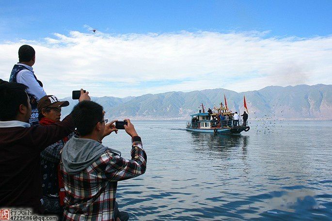 (海面上,载着本主神像的彩船,从北岸的红山本主庙逶迤而来、在海上绕行、而后渐行渐近。)