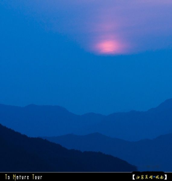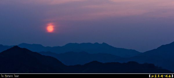 午饭后在店主房顶的最佳位置早已放好的三脚架已经被移到了一边,还好大多数是拍了就走的,还能找到有利位置。日落前期的景象一般,天边云层偏厚,落日一会儿就隐入云层中了,天空仅有微红,平淡得很。但我们还是坚持不等太阳完全落山坚决不走的原则,就当天台上只剩下我们四个的时候,红红的太阳又钻出云的缝隙,衬着远处深蓝色的山峦,非常美妙!也就两分多钟,太阳再次隐落在云层中,天空顿时变得一片灰暗。