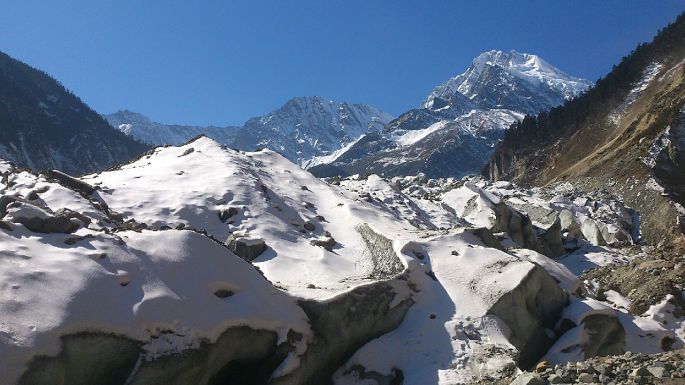 绝大部分人都会选择继续走到冰川舌,与冰川亲密接触。正午的太阳很烈,可雪一点融化的意思也没有。