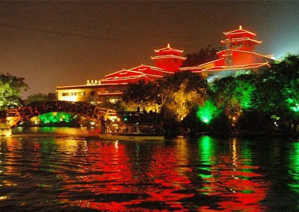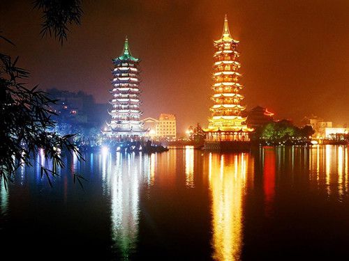 两江四湖是桂林城区环城水系,由漓江、桃花江、榕湖、衫湖、桂湖、木龙湖组成。榕湖,杉湖位于桂林市中心,秀峰、象山两城区接合部,阳桥的两侧。桥西为榕湖通桃花江,以湖畔生长古榕树得名;桥东为杉湖,连漓江,因湖这边长有杉树命名。榕湖、杉湖、桂湖原为唐宋时期桂林的护城河,泛舟湖上,可尽览城区诸胜。站在杉湖日月湾码头,可见日月双塔,日塔和月塔交相辉映,成为桂林中心城区标志性建筑物。坐上了两江四湖的船,船上还有民族乐器在演奏。岸边的灯光陪着这传统乐调,我满是喜欢,江里水汽蔓延,江风清冷,水在竹筏边泛着浪花。“我们该买上酒在这里喝就好了”。坐我旁边的年轻女孩如是说。自己从来不是嗜酒之人,可这时的氛围却有着让人对酒当歌,人生几何的感触。乘坐在游船上,穿越而过的桥梁,引起我极大的观赏兴趣;古代诗词文名家的浮雕像,射灯映衬下更是光辉照人!紫色的玻璃桥玲珑剔透,完美的造型和浪漫的紫色,留给游客无比宽泛的空间想象,似天上仙境于人间,些许赞叹声连连!晚上的玻璃桥别有一番滋味。沉醉在这迷人的山水夜色中,有点走神,导游后面的解说词略过。