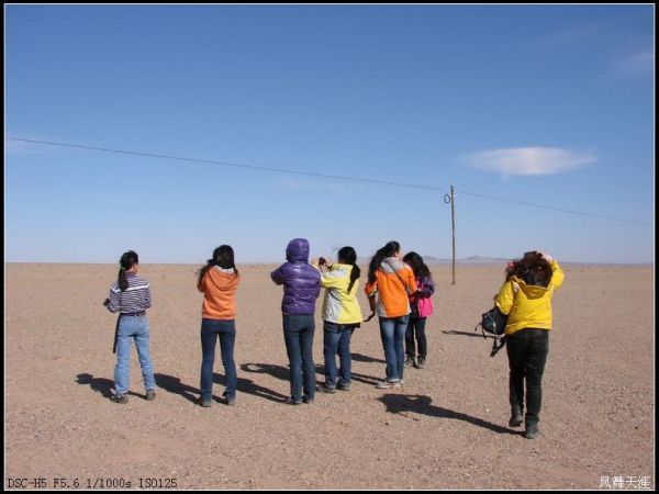 天还没全亮,我们还没有收拾停当,司机大哥已经很准时的等候在旅馆门口了。心里又开始庆幸,此次又找到一个可靠的司机,我的第六感觉又帮了我。我们连同行包塞进满满当当的车厢,向着西方继续出发。天空云层压顶,很担心没有太阳出来,那胡杨的色彩会逊色很多。过了左旗,太阳终于晕红了东边的云霞,让我舒了口气。出了阿拉善,茫茫原野一望无际,天际相接只看见地平线,公路延伸到天的尽头。路边旷野上鼓起一个个小土包,长满一簇簇不知名的野草。星星问这是沙漠么?我怎么看都不像,随口回了句不是。司机师傅插了句这是戈壁滩。星星很嗔怪的叫了我一声,顿时我明白了:我曾经在网上忽悠她,草原哪有戈壁,最多的是沙漠呗,嘿嘿,看样子我有些不学无术。太阳完全升起来后,乌云不知道什么时候就无影无踪了。偶尔有三三两两的骆驼在闲荡。星星起先很激动的拿着单反咔嚓不停,对于所看见的一切充满了好奇。谁知道连续五个小时都毫无变化的一路荒芜到底,最后只有选择睡觉。诺言他们虽然也嬉笑不断,却也是抵挡不住这十个小时的车程,除了偶尔兴奋的合唱一曲外,也相继迷糊了又清醒,清醒了又迷糊。为了安全,我是大家迷糊时清醒,大家清醒时候迷糊。难得振奋大家一次的是天边出现了虚幻的山峰和水影,本来没在意,后不知道怎么想起来:不会是海市蜃楼吧?闻听此言,大家激动的赶紧叫司机停车,询问早停于路边的车:那是不是海市蜃楼?得到肯定回答的大家争先恐后的奔下车,纷纷对准那虚幻的影子拍个不停,也不管到底拍到了什么。不过还是询问了从很远地方返回的车,那是不是海市蜃楼?回答没追到头,更让我们确定很幸运的看到了戈壁奇观。谁知道司机一瓢冷水浇下来:我们经常看到过,都司空见惯了。这不是海市蜃楼,是光的折射,于是索然无味继续赶路。