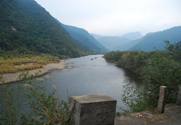 竹排始发地的对岸就是青龙山,乘客靠自助拉缆绳乘船往返。