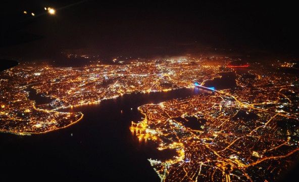 装备好长途飞行必备的头枕、拖鞋和眼罩后,我们就开始梦周公啦。由于过于兴奋大家在飞机上都没怎么睡好,飞机因为要等一部分乘客晚点了一个多小时,我们于土耳其时间凌晨2点左右抵达伊斯坦布尔。第一印象果然是资本主义国家啊,大半夜的灯火通明,飞机上俯瞰博斯布鲁斯海峡特别美丽。