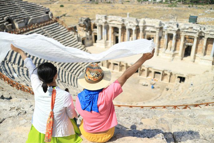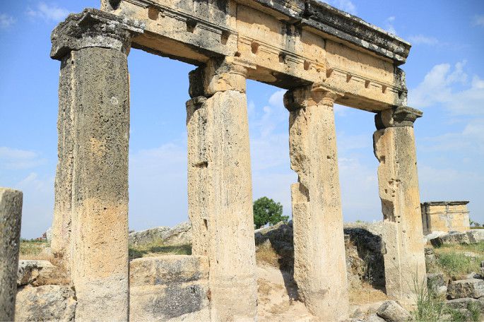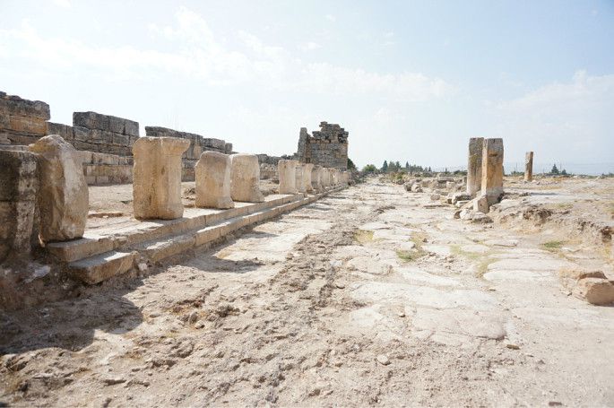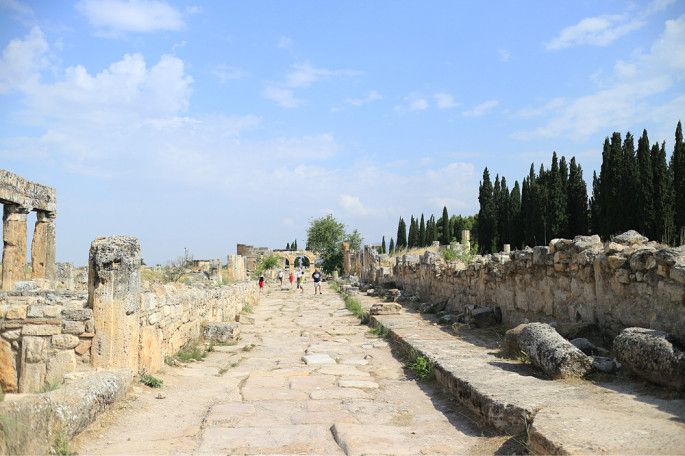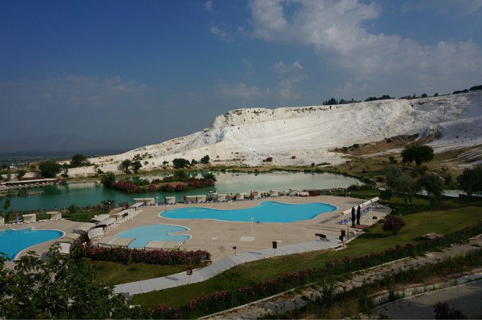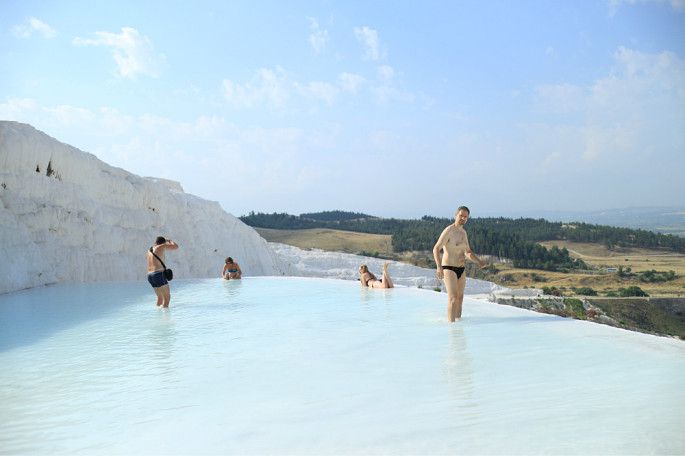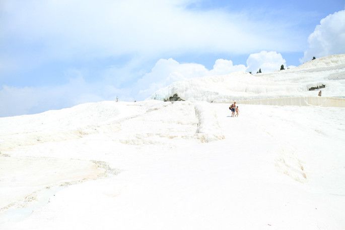 走过白色的钙化堤,上面是一个古代建筑遗址。