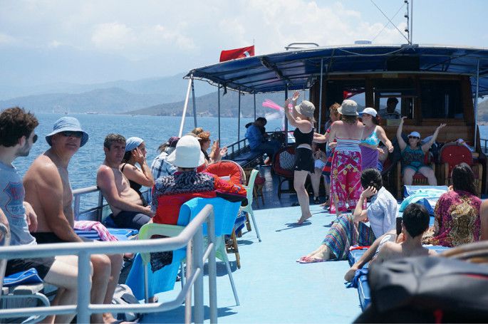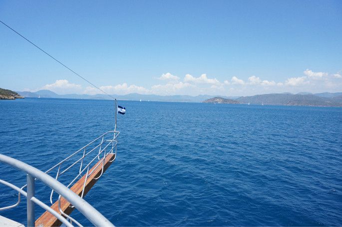 吃过早饭,大叔派人开车把我们送到了码头。码头停靠着许多艘游船,通常是10:30或者11:00点出发,票价在10-15LE不等,,要看你砍价的功夫如何了,含一顿午餐。晚上6点左右回到港口,全程途径12岛,有5个停靠点,可以下海畅游一番。水质好的没的话说,地中海的海水蓝的呦,心都要碎啦。不过要小心海底的石头和珊瑚,脚一不小心就会被划伤。船上的DJ一路放着欢快的土国神曲,大妈们翩翩起舞,还拉着我们一起跳,不过我这舞技真是不好意思在土国丢人现眼啊。
