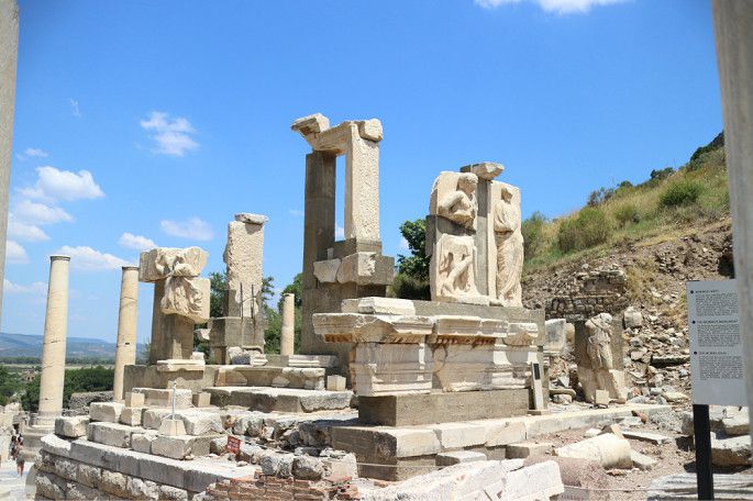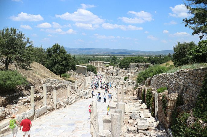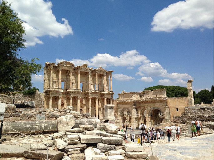 以下内容来自百度: 以弗所常常被西方人称之为土耳其的庞贝,以弗所是地中海东岸保存得最完好的古典城市,也是早期基督教的重要中心。这是一个大型的遗址至今只挖掘了一部分。已经挖掘出的那部分向我们展现了该城原来的繁华。戏院非常之大,是通向海港的海港街道的主要景观。很不幸,阿尔忒弥斯神庙,世界七大奇迹之一,只留下一些不起眼的圆柱。神庙的大部分艺术品都被英国人带走,今天收藏在大英博物馆中。