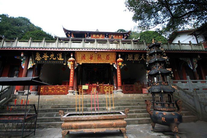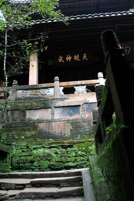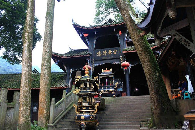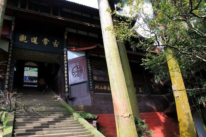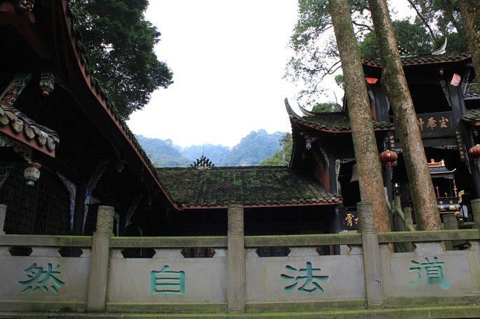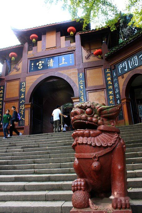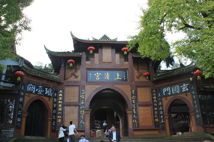 途中经过老君阁景区的入口,考虑到体力没上去。13:00时到达上清宫,上清宫位于青城山第一峰、距峰顶约500米的半坡上。上清宫始建于晋代,现存庙宇为清朝同治年间所建,宫门"上清宫"三字由蒋介石题寅。宫内祀奉道教始祖李老君,有老子塑像和《道德经》五千言木刻,还有麻姑池、鸳鸯井等传说遗迹。