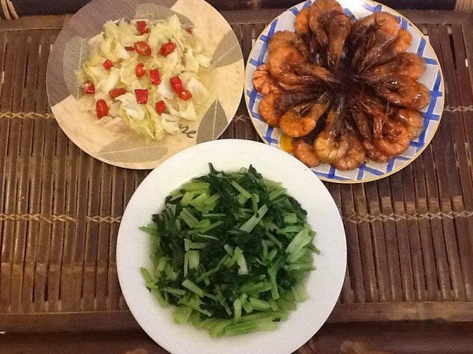 在菜市场买了1公斤明虾,合人民币16元一斤,当然是经过讨价还价的成交价。还买了些蔬菜。