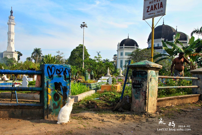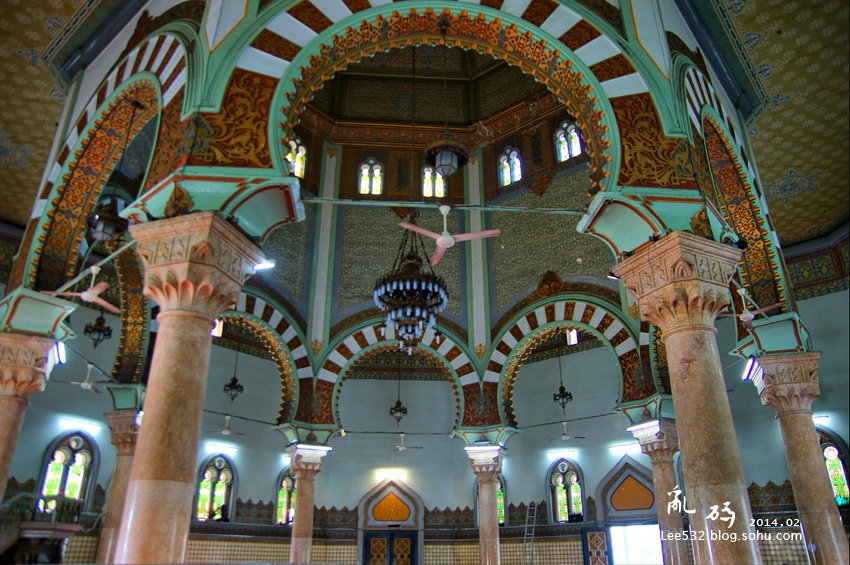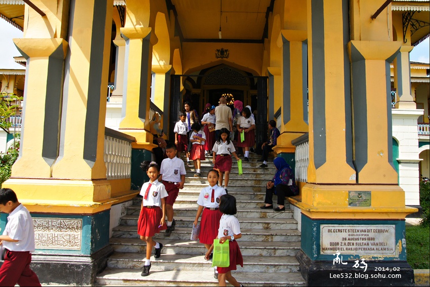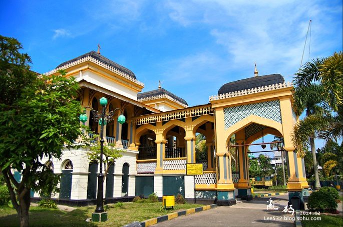 2↑宏伟的大清真寺座落于棉兰市中心附近有很多旅馆,初来乍到的背包客通常都会选择在此留宿,然后第二天就会搬走,因为清真寺厕所屋顶上的大功率高音炮每天早晨四点就开始念颂古兰经来惊醒全市睡梦中的穆斯林起床做礼拜。这座建于1906年的清真寺黑色月牙圆满拱屋顶有别于一般,寺内的弓型窗户配以绿色白瓷砖墙非常壮观美丽。