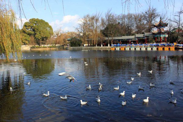 我们在客运站吃了早餐就坐车去了翠湖公园。公交车站在客运站门口的车站往前走再过一个红绿灯。坐82路道小西门下在往回走一段在立交桥下右转一直走看到很多海鸥的就是翠湖公园了。