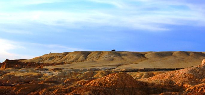 自驾游的游客居然将车停在坡顶上远看还真够酷了。