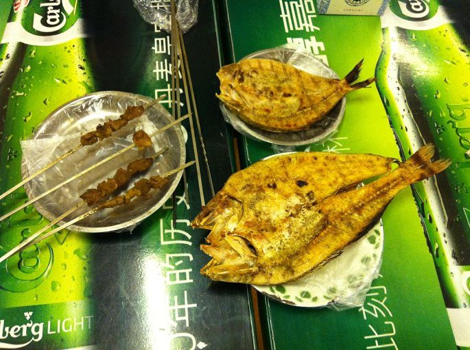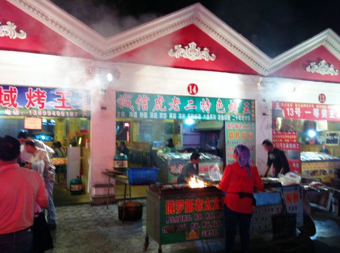 下午8点回到布尔津,旅游团晚餐改自助,这样我们就有机会逛夜市和品尝当地的烤鱼了。