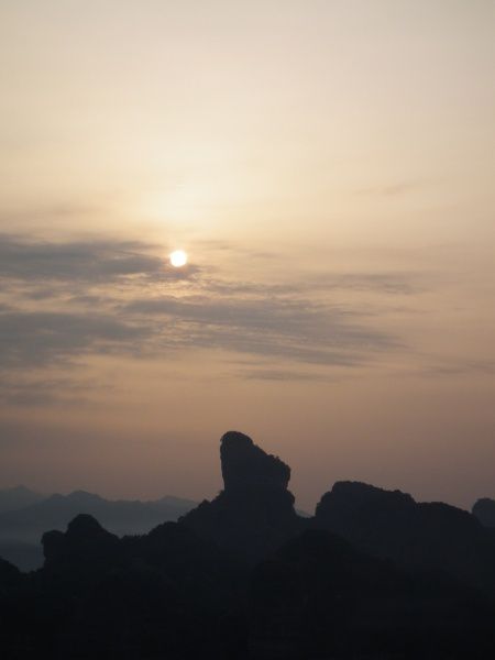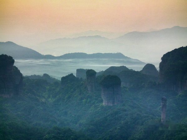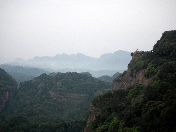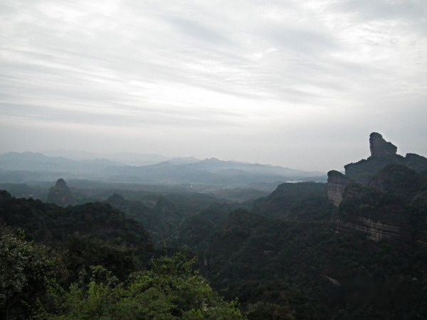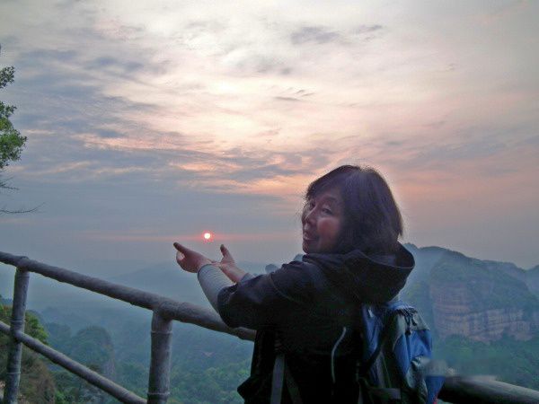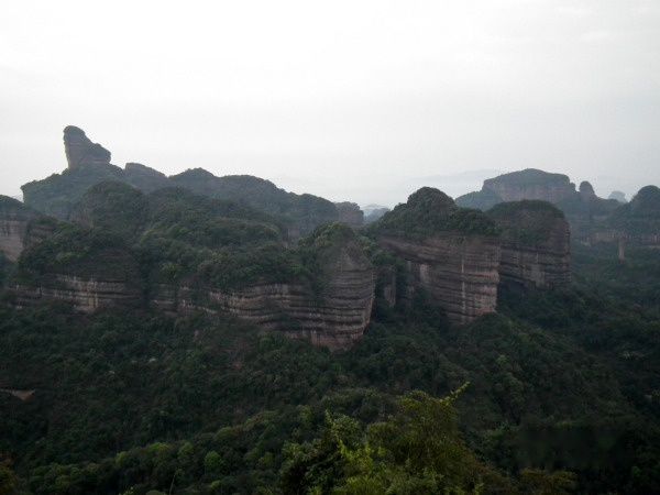这里景色非常好,是看丹霞山最好的地方,也可以看日出,但是因为今天云层太厚,我们失去了看日出的机会。等了会,天渐渐亮了,看看景色真的不错。