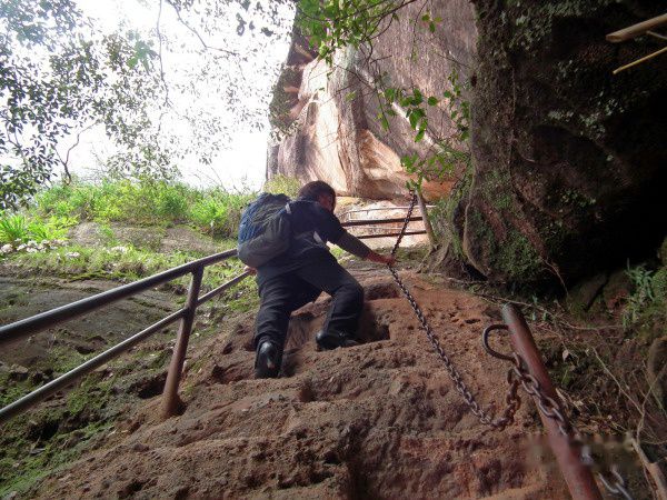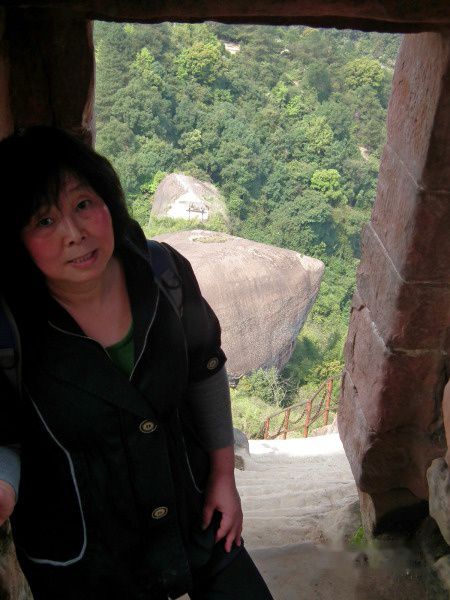 这是在山脚摄的云崖栈道的远景,中间的几个白点是上到半山缓坡的几个年轻人,他们的同伴和我们一起在山脚下仰望。我和老伴虽然60了,还是脱下毛衣决定爬上去。