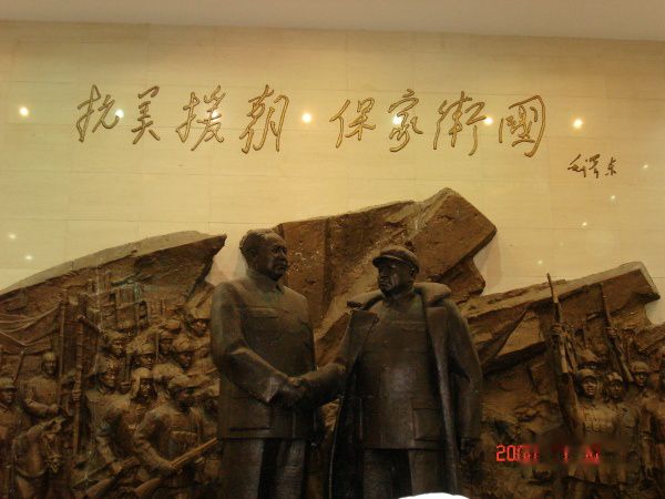 陈列馆序厅的正面以“抗美援朝 保家卫国”浮雕群像为背景,正中是毛泽东和彭德怀的巨型雕像。