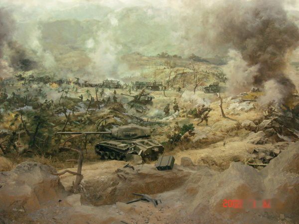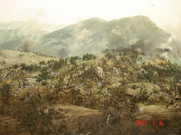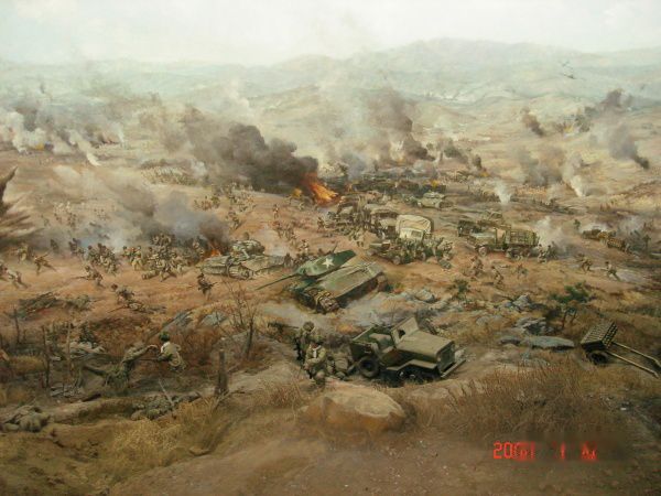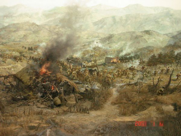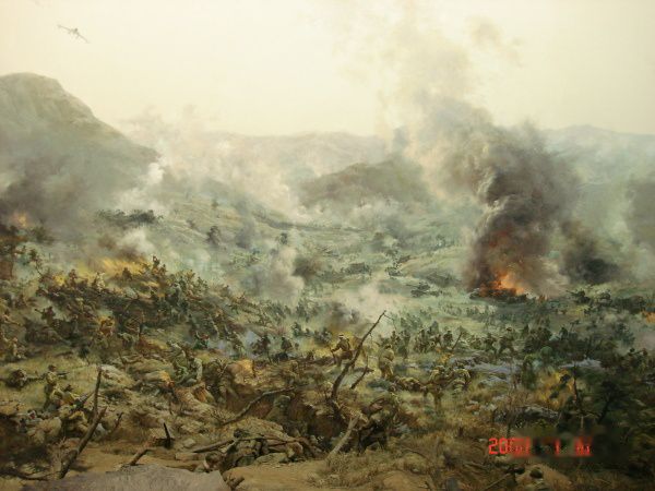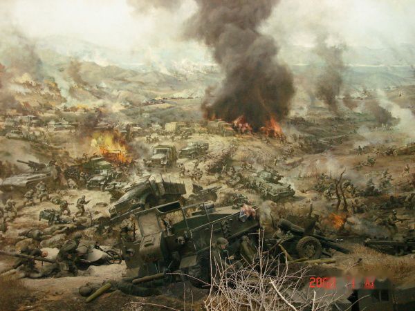 全景画馆是高28.4米,直径46米的圆形建筑,采用现代科技手段,将绘画、塑型与灯光、音响融为一体,生动形象反映了扭转朝鲜战局“清川江畔围歼战”的历史场面。画高18米,周长132米,站在电动转台上,就可领略这场战争的宏伟气势和志愿军战士的英雄气概。这是部分画面。露天兵器陈列场还陈列了飞机、大炮、坦克等重型武器装备。
