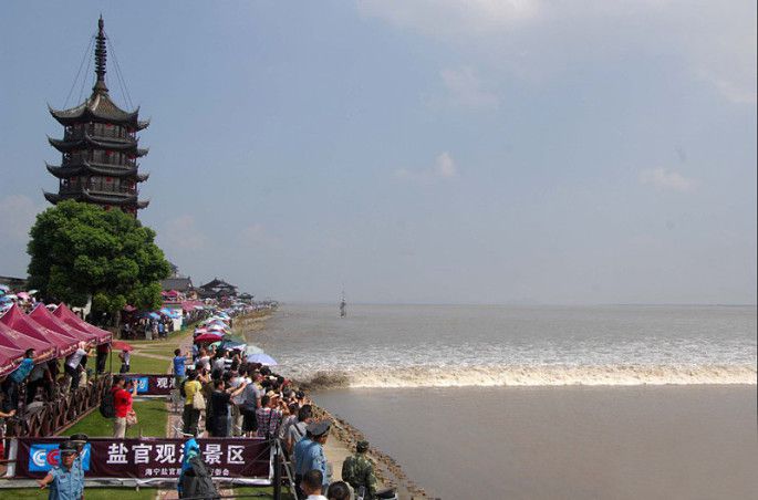 不同的地段,可赏到不同的潮景:从西往东,钱塘江南岸萧山南阳的赭山美女坝观回头潮,老盐仓观回头潮,盐官古镇观潮胜地公园内观"一线潮",八堡看"汇合潮"。