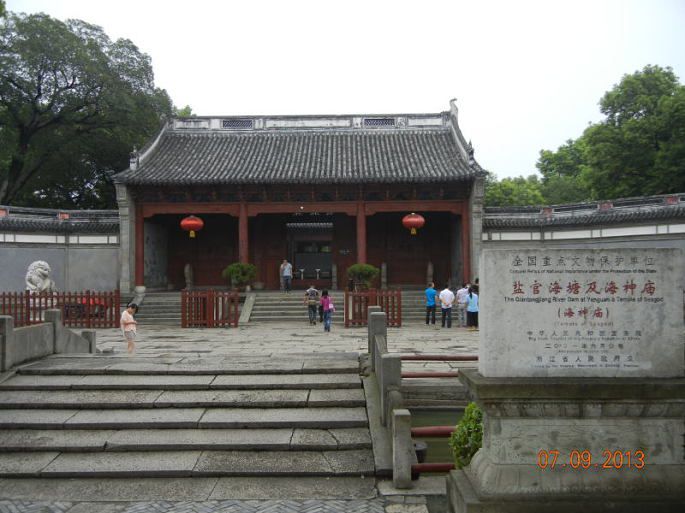 海神庙的兴建,印证了清政府重视海塘修筑的程度,特别是雍正、乾隆两朝更是把它作为国家重点工程,不惜动用巨大的人力物力,与此同时,为了配合这个伟大工程的顺利进行,清政府还在宣传上营造良好氛围,于是,在这钱塘江边,仿造了一座“江南故宫”,专祀传说中的“浙海之神”,以求得“保厘东海”、“永庆安澜”,让老百姓有祭祠海神之所,同时,帝王之家下江南巡视海塘也不忘在这里拜一拜那浙海之神。今天,我们走进海神庙,依然看得到正殿中设有一无名之神,钱鏐、伍子胥享配左右。因为有海神的保佑,才有子孙后代的平安生活。