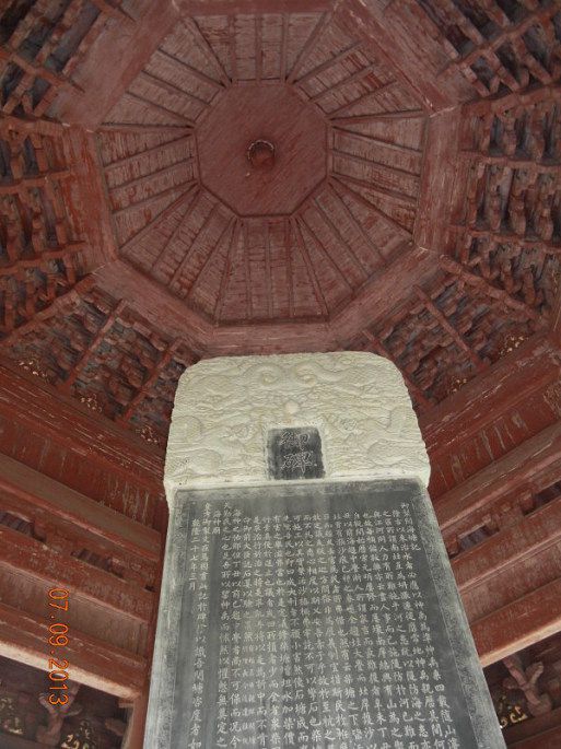 为了显示这个庙宫的不一般,雍正帝亲自书《海神庙碑记》,后来乾隆帝也亲自书《阅海塘记》。这两件出自帝王之家的墨宝,俨然是海神庙中又一引以为自豪的珍宝了,在正殿后有八角重檐攒尖顶御碑亭一座,亭内有御碑,通高约五米,为汉白玉石质。碑额浮雕飞龙朱雀,双龙抢珠。碑身及碑座周刻飞龙、如意、万字及海水图案,精美绝伦。碑身阳面就是雍正的《海神庙碑记》,阴面为乾隆帝的《阅海塘记》。这是何等的规格与荣耀,为海神庙独有。