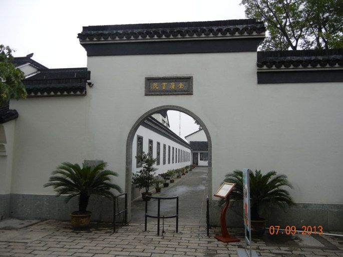 穿过桃李门,就来到了金庸书院的正门,为砖雕台门。跨过石质的门槛,走过小石桥,便是书院的中心--讲堂,名为书剑堂。古朴的大讲堂坐落于一池碧水之上,丝丝细雨轻轻落入池中,装点着这一座带着浓浓文化气息的建筑。