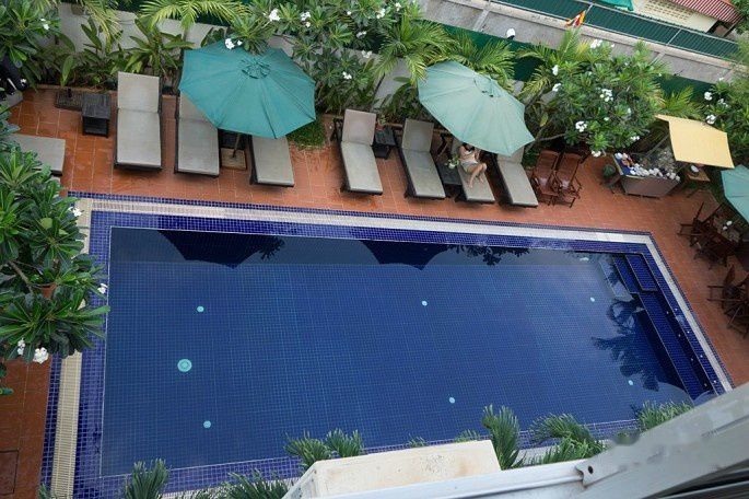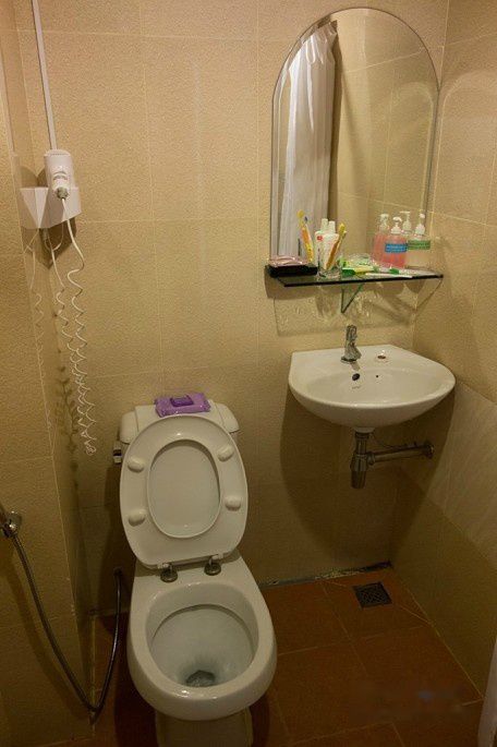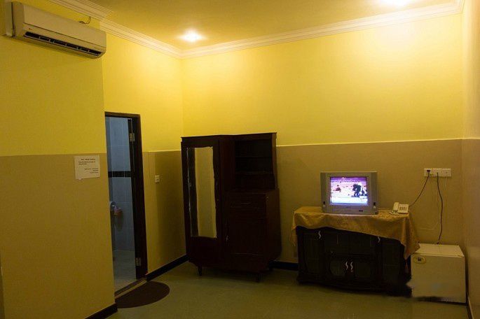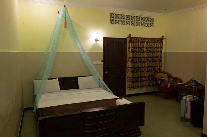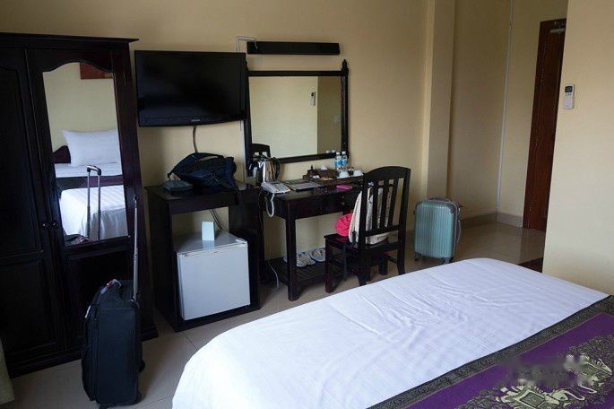 这家Golden Noura Villa-Pub & Restaurant和暹粒的Motherhome Inn比,条件就差远了,很一般,当时定这里主要是看中位置和性价比。这家旅馆的位置很好,离我们要去的金边国家博物馆和柬埔寨皇宫都很近,步行5-10分钟就到了,可以省下打车钱,价格也只有20美刀一晚。条件不能说差,只是比较简单,装修和家具也很过时。本来店家安排在一楼的房间,但老婆怕吵也怕潮,看了其它空房,最后选了6楼的这间,房间比楼下的大很多,就是需要爬楼,这里没电梯的。
