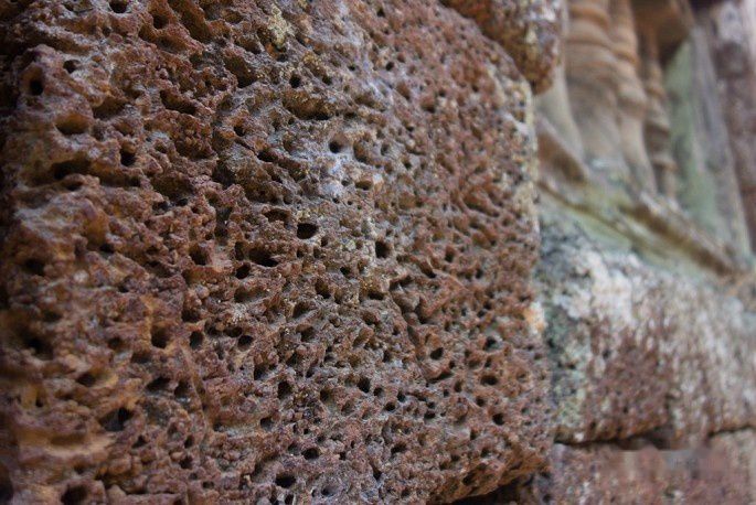 吴哥古迹的外层围墙,一般用的是较差的石料。普里卢的外墙经过千年的风吹雨打日晒,已经风化出了很多缝隙,看起来象海绵一般,当然,都是硬的