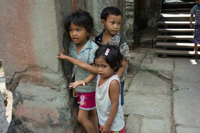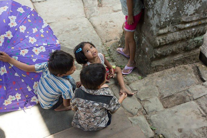 几个当地的柬埔寨小朋友在里面玩耍,这几个小孩没向游客要吃的,也没有兜售小东西。那个小女孩很可爱,有点象我家小妞