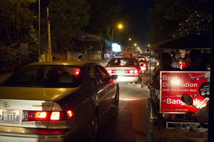 大巴慢悠悠的开啊开啊,天黑一段时间了才逐渐接近金边。金边邻近的路好了很多,升级成国内省道水平了,小车也开始多了,毕竟是首都嘛。就这样,340公里的路居然跑了7个小时,平均时速不足50公里,真是够慢的了。