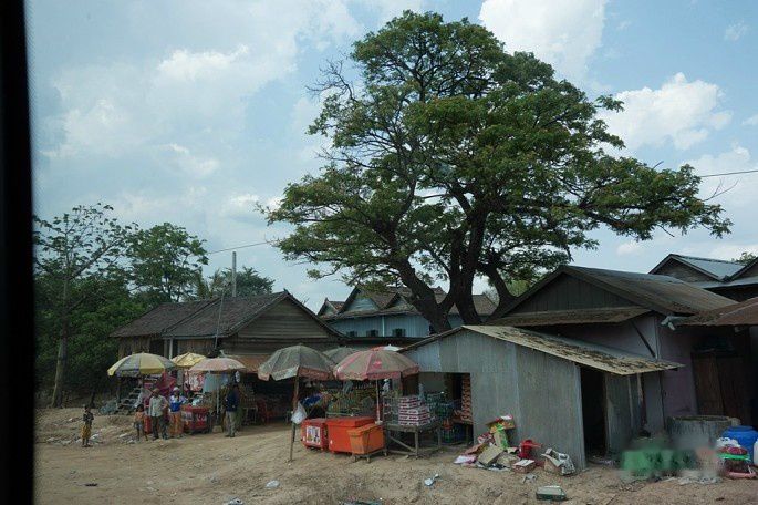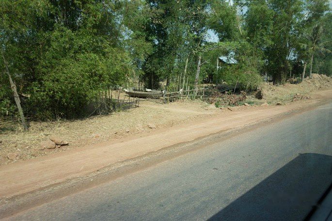 暹粒到金边的路(好像叫6号公路)路况不太好,相当于国内的县道,还不断的碰到修路,340km的路要走7小时。我们这趟车中途休息2次,第1次休息时间较长,供司机和游客吃午饭,第2次休息时间短,就上个厕所。上一些沿途的景色。