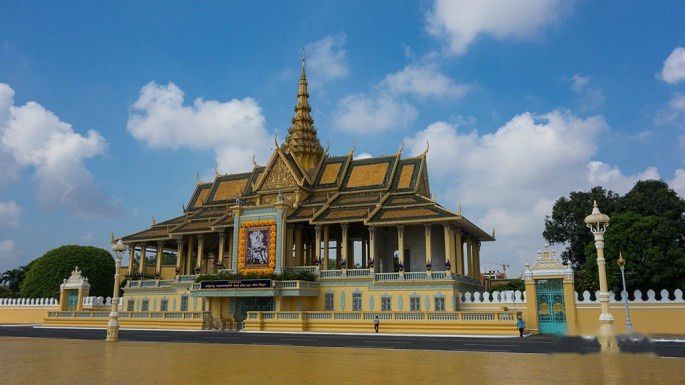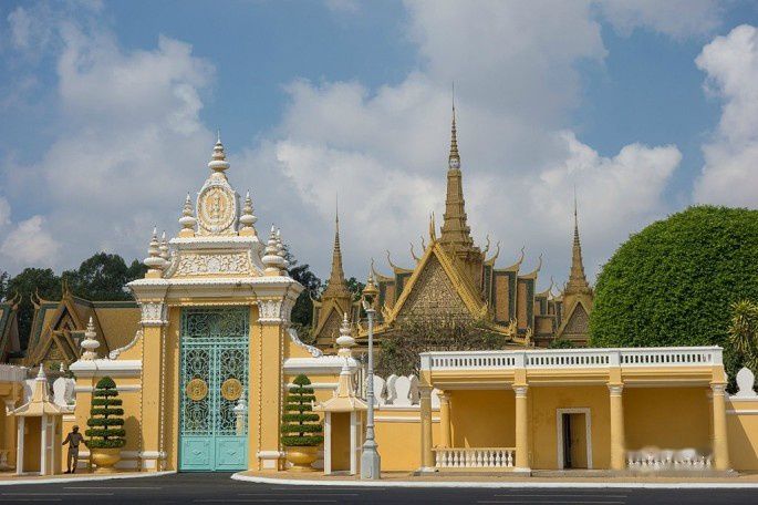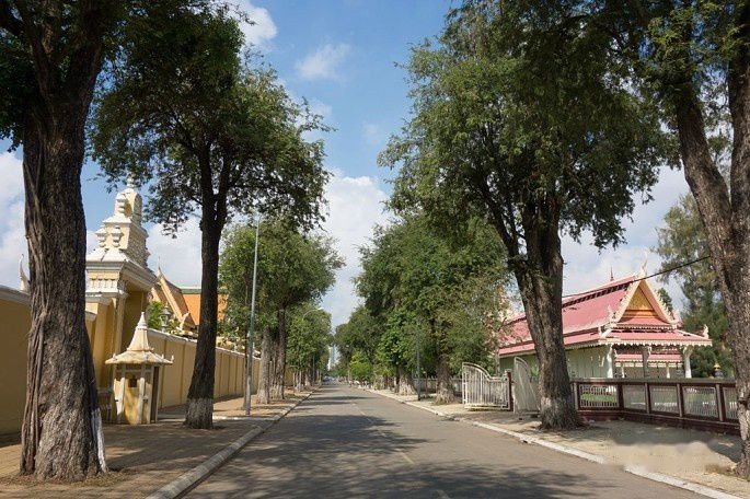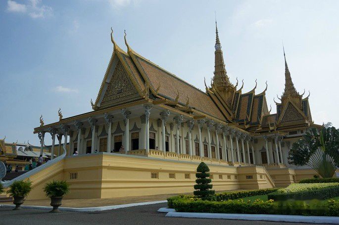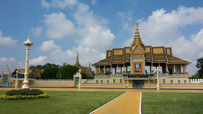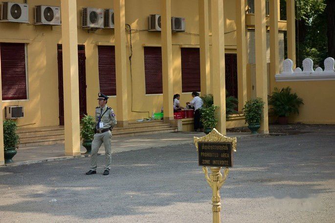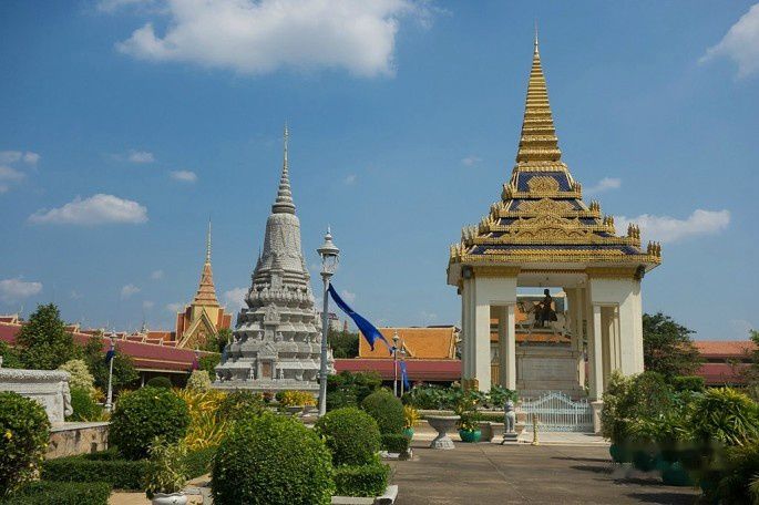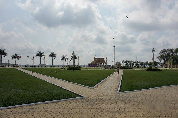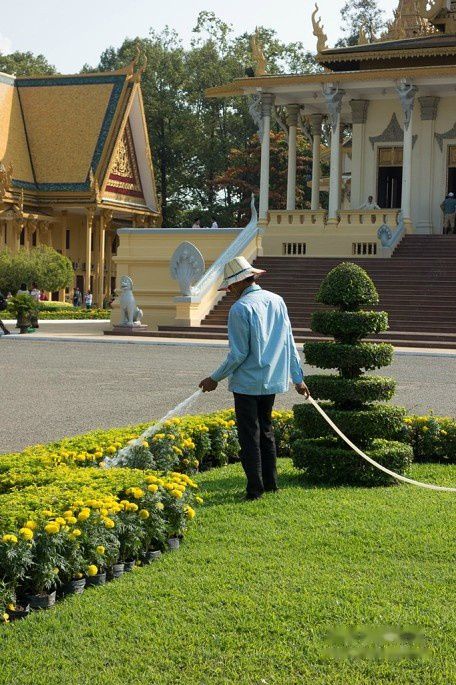 起得晚,吃完早餐9点了,金边的太阳已经很大了,赶紧按照计划去皇宫,走了10分钟到皇宫,中途还路过了国家博物馆。还没走到皇宫门口,就被1位拉客的tuktuk车司机告知今天早上皇宫不开放,要到下午才开放,我们将信将疑,跑到皇宫门卫那里确认了一下。果然,今天早上皇宫里有活动,好像是皇太后举行个什么仪式还是接待客人来着,所以不对外开放,还好下午2点开放,要不就白来了。于是我们就在皇宫前的皇宫广场逛了一下,从广场先看看皇宫,然后修改行程早上先去博物馆。