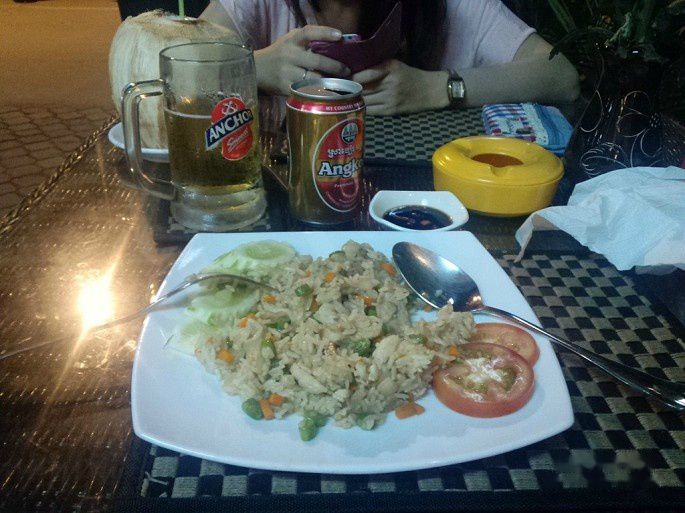 收拾完行李,洗完澡也9点多了,旅馆一楼就有餐厅,直接就在楼下吃晚饭了。餐厅晚饭的味道还不错,价格也公道,又要了一听昨晚喝过的吴哥啤酒,真的好喝,连我这种平时不怎么喝酒的人都喜欢,可见味道真的不错。